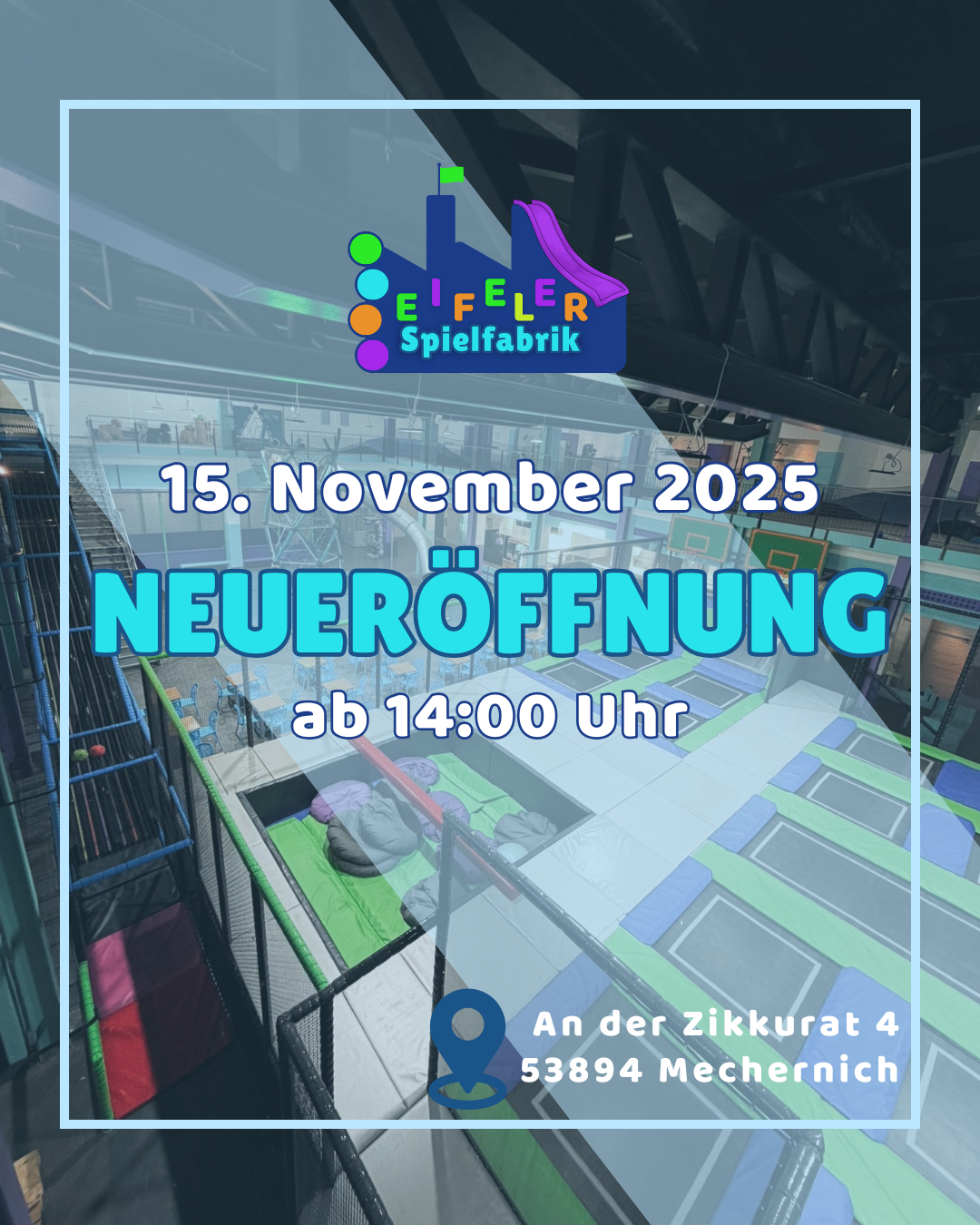 An der Zikkurat 4, 53894 Mechernich-Firmenich info@eifeler-spielfabrik.de Events Hier findet ihr alle Events die anstehen Eröffnungsparty - Beendet!Wann: 15.11.2025 Wieviel Uhr: ab 14:00 Uhr Wo: In der Eifeler Spielfabrik (An der Zikkurat 4 - 53893 Mechernich-Firmenich) Kommt vorbei, entdeckt unsere bunten Spielwelten und feiert mit uns unsere große Neueröffnung! 🏰🛝