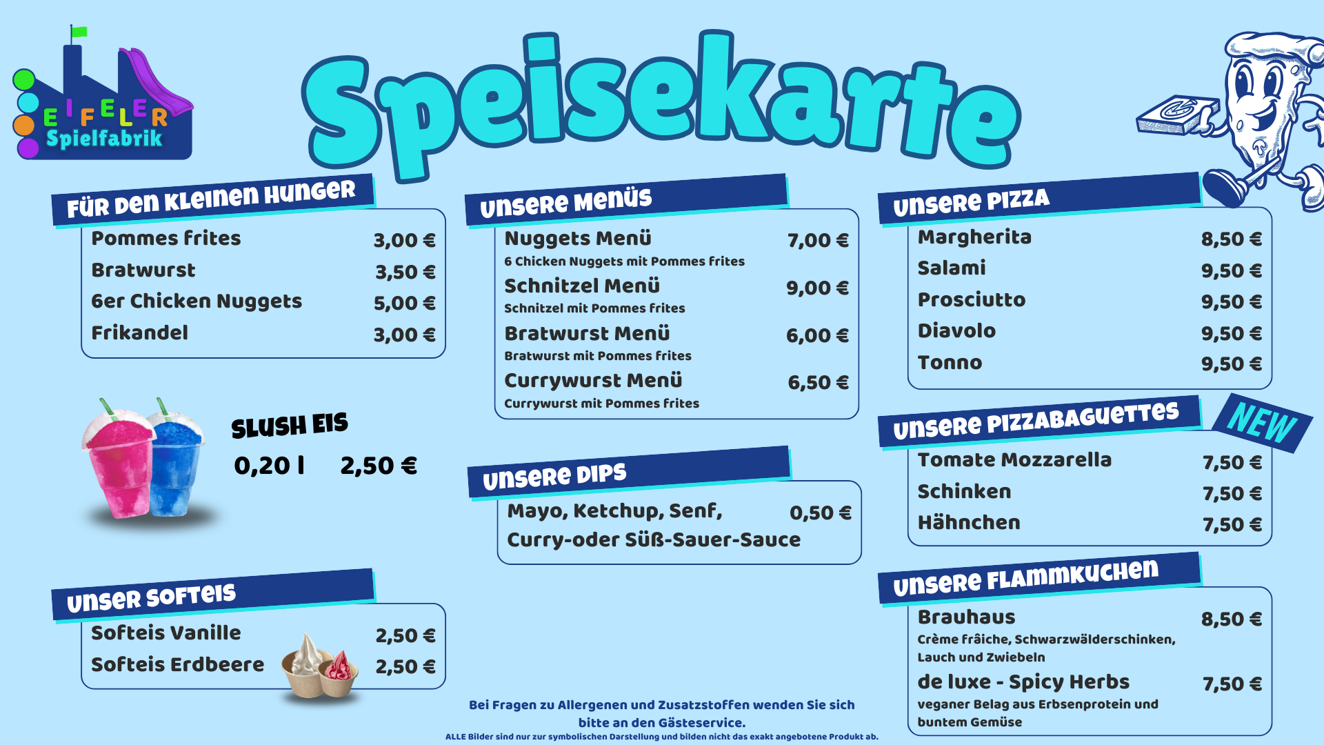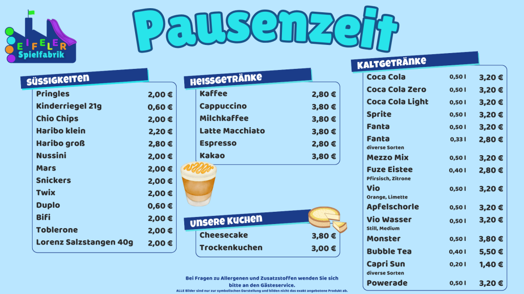 Vor, während oder nach dem Spielen könnt ihr euch in unserer Snack-Bar mit Blick auf die Eifeler Spielfabrik verwöhnen lassen. Genießt eure Lieblingspizza oder einen anderen Snack – frisch für euch zubereitet.